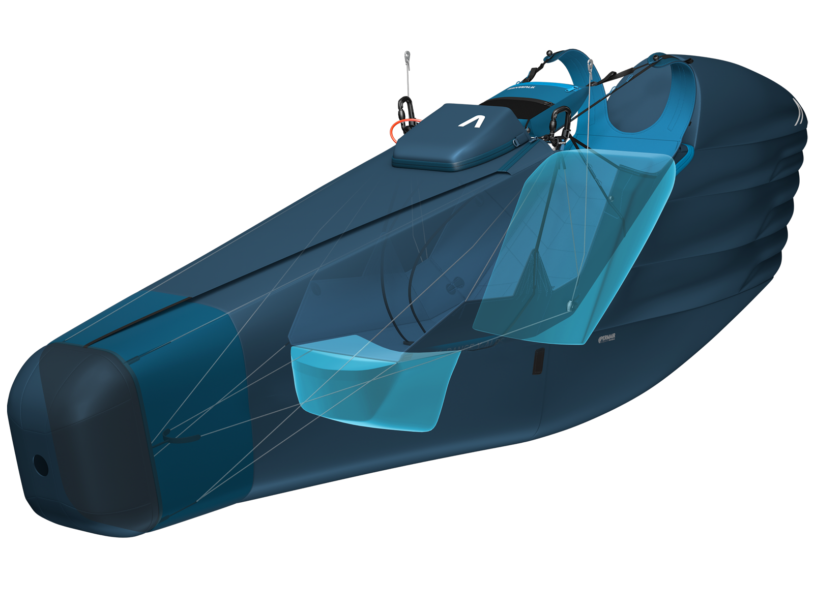 The ram pressure fairing inflates due to the incoming air and recombines the flow behind the pilot. This significantly improves drag and increases glide performance.